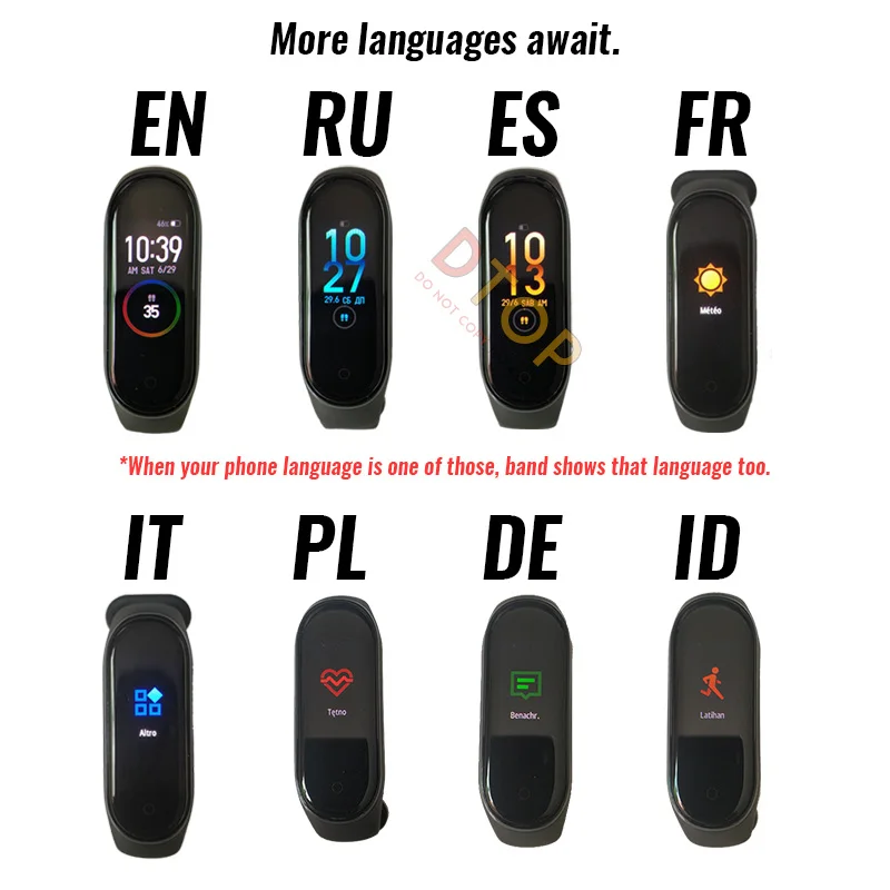 2019 Original Xiaomi Mi Band 4hi, I just tested the global version and China version mi band 4 standard edition, 9 languages in the band, Chinese, English, Russian, Spanish, Polish, French, Indonesian, German and Italian. When your phone language is one of above, band shows that language too. Both version will be updated to more multi-language at the same time. this link is China version, for its competitive price.
